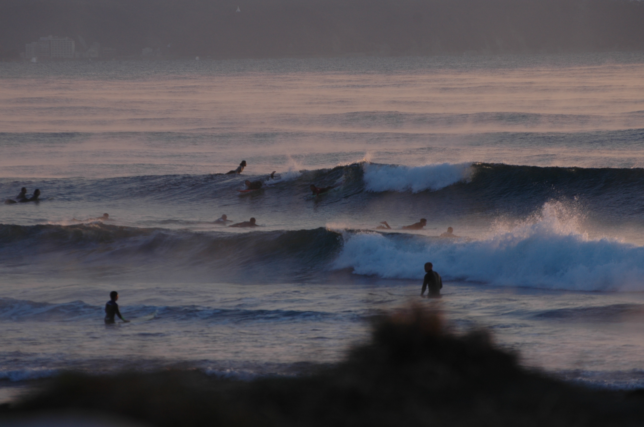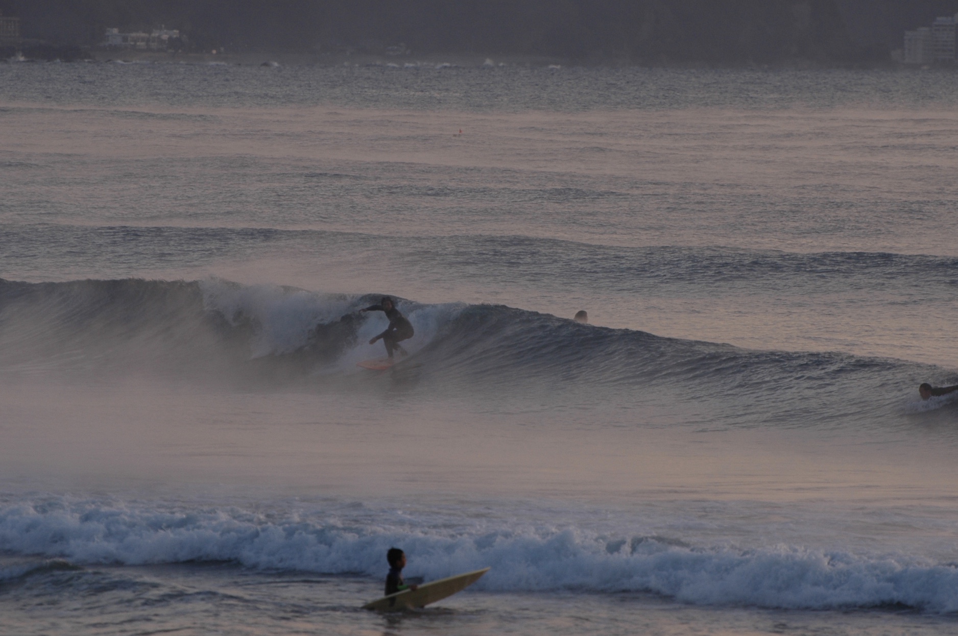 海面から湯気がでる日曜の朝イチの海は多くのサーファーで賑わっていました。