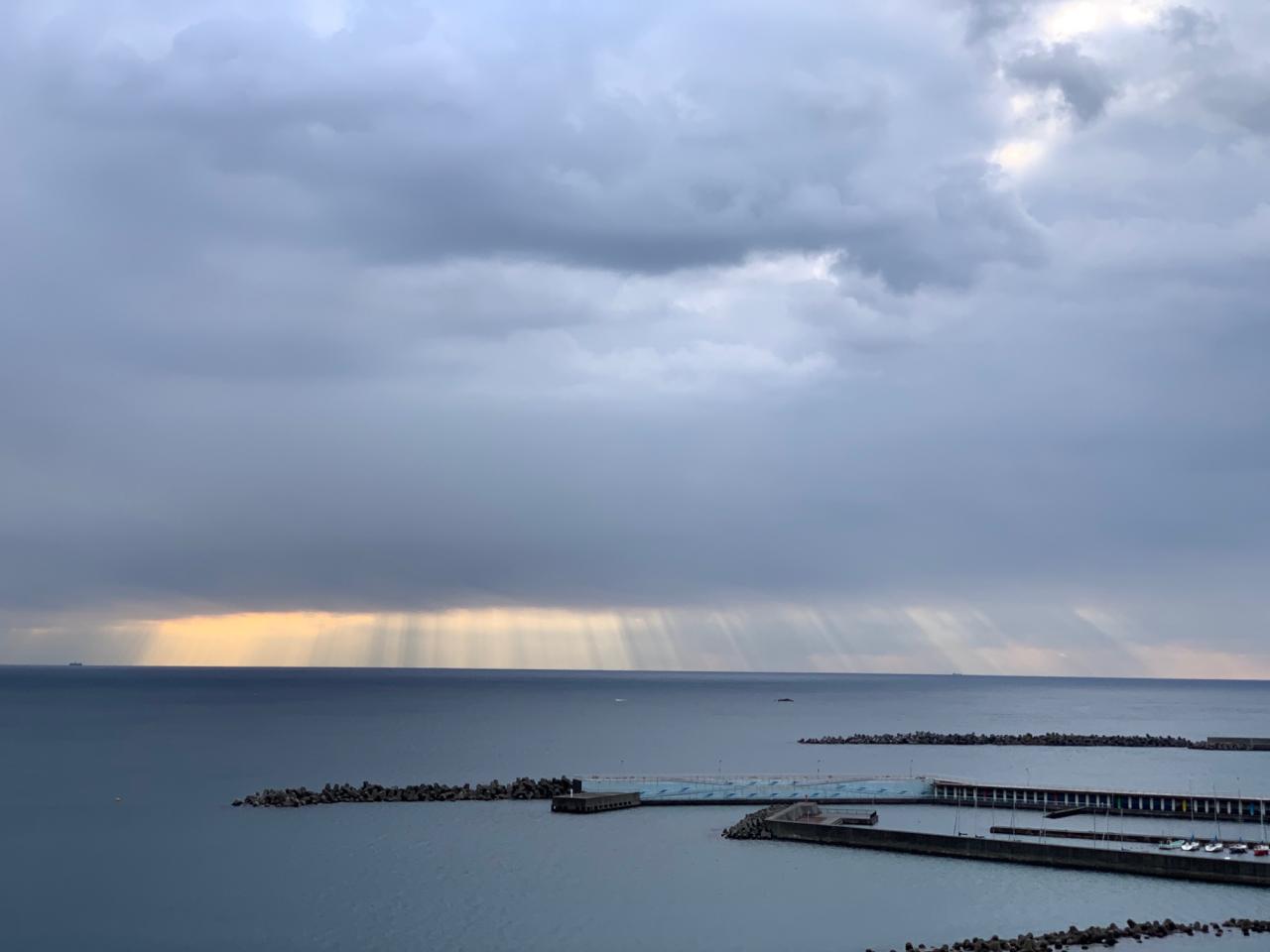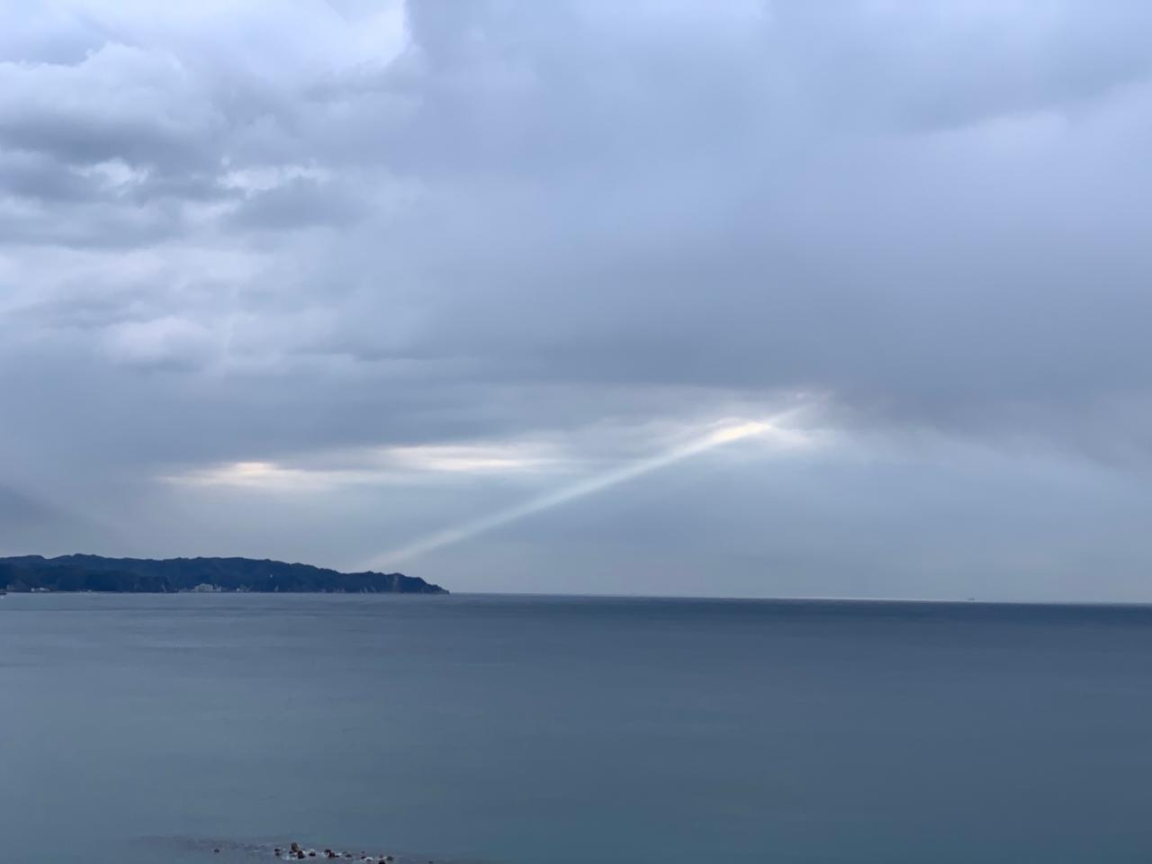 早朝の海には雲の隙間から”天使の梯子”と”天使のビ-ム”が。。