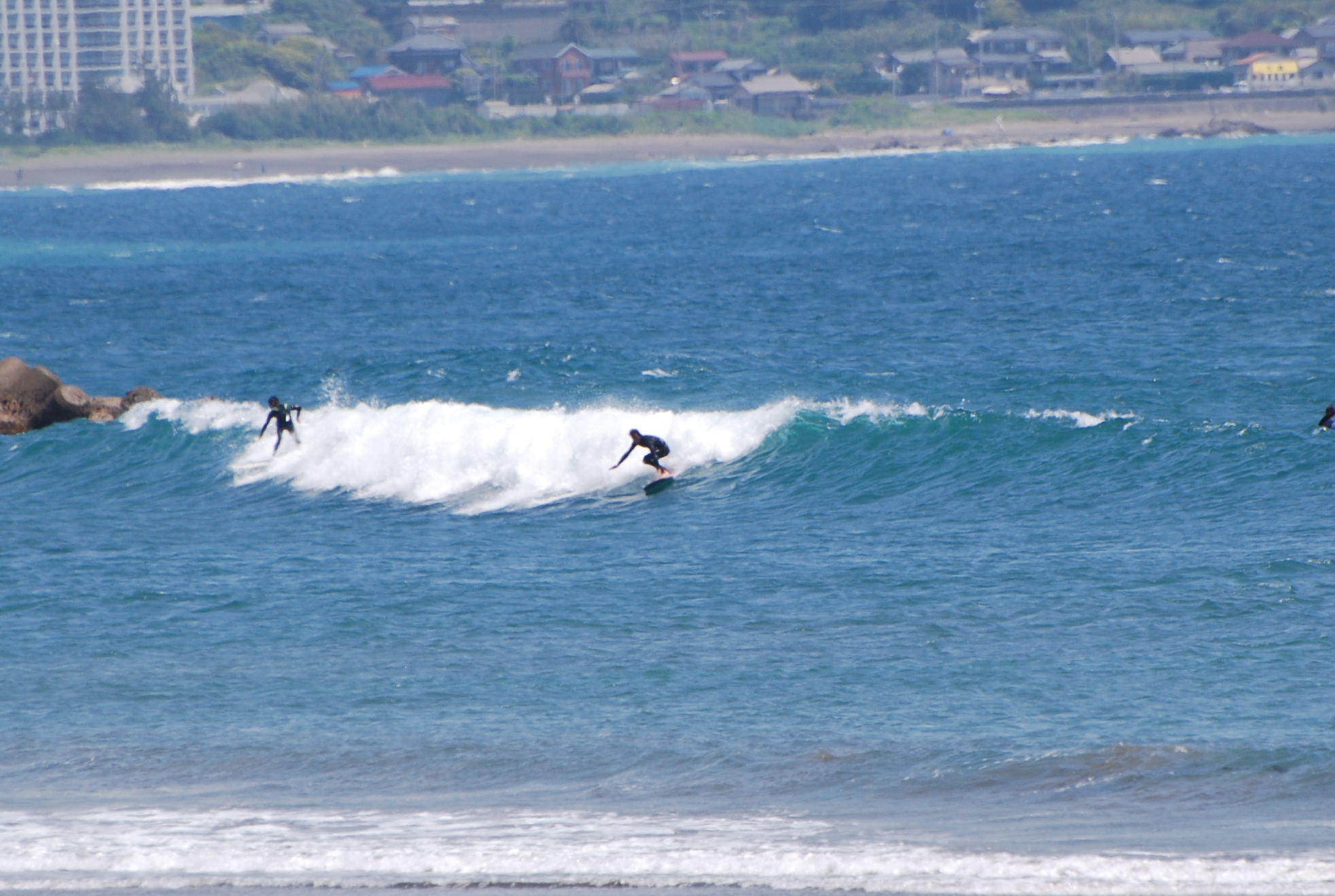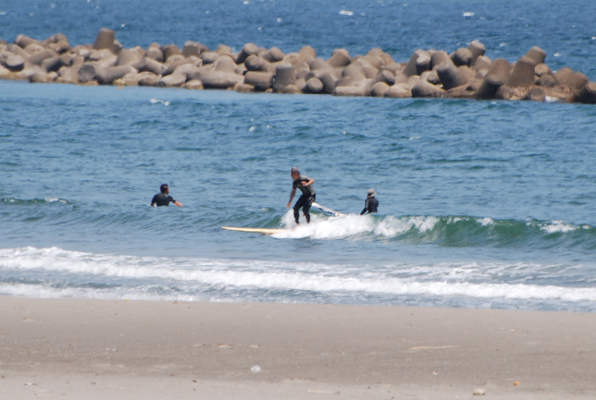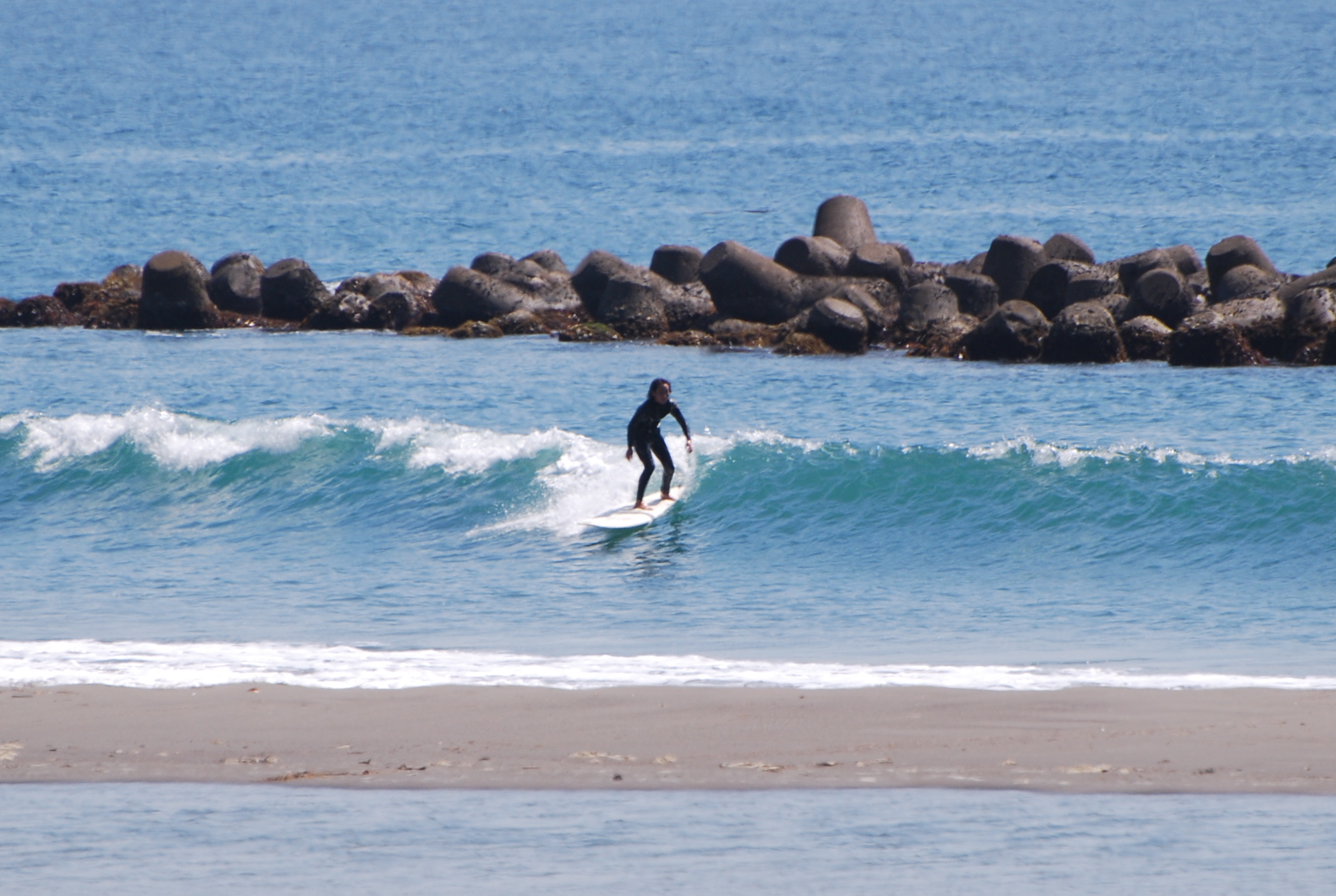 快晴の鴨川っス!そんな中、厚めのブレイクながらロングボードにはおあつらえ向きな波となっています。