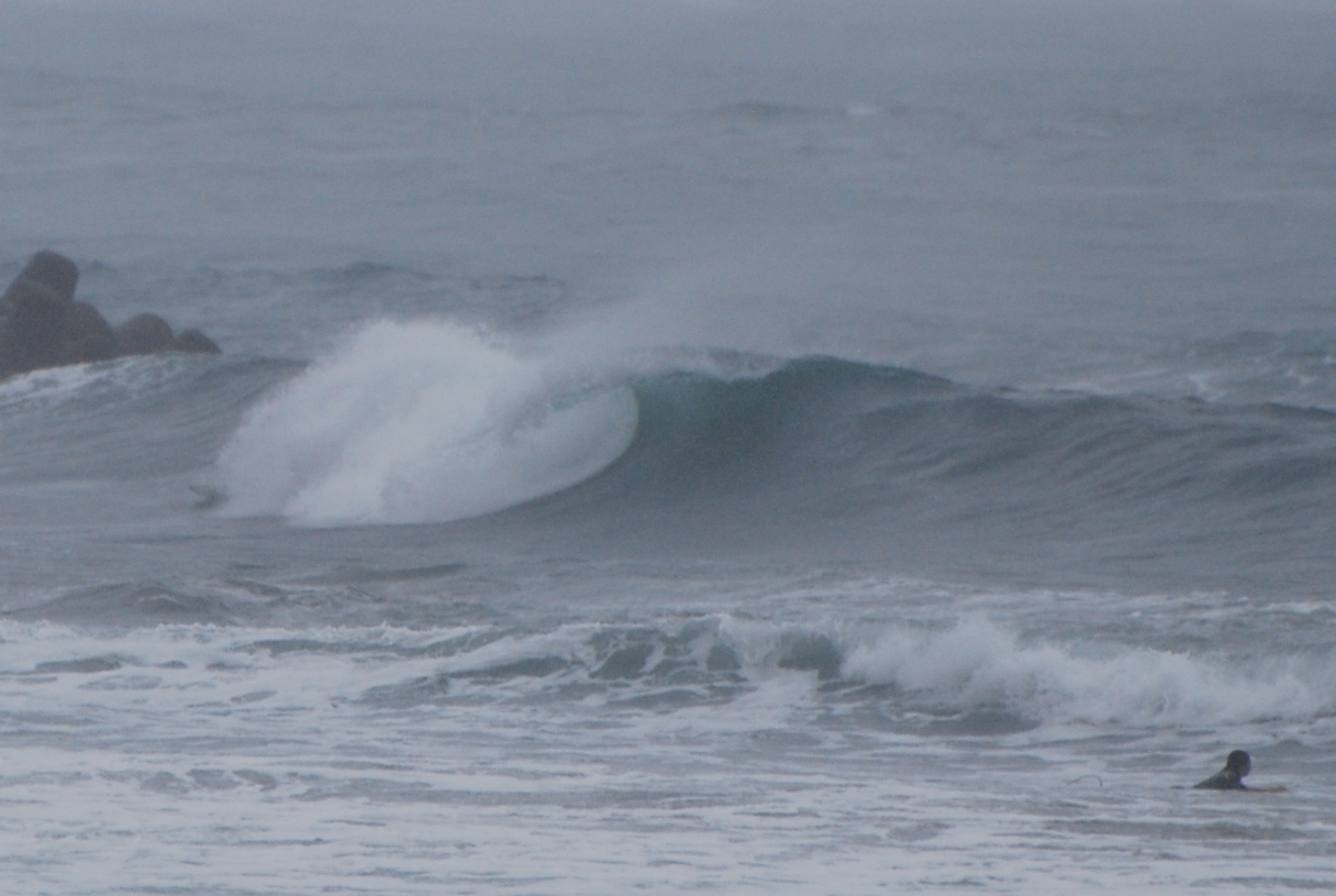 波は今のところムネ〜カタ、たまにアタマ前後、ヨレが入ったややボヨついたブレイクですがサーフ可となっています。