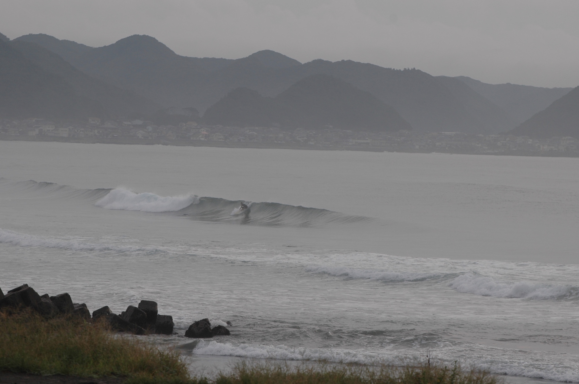 朝イチの河口Pは無風の面ツルコンディション、セットでムネサイズほどの良い波。