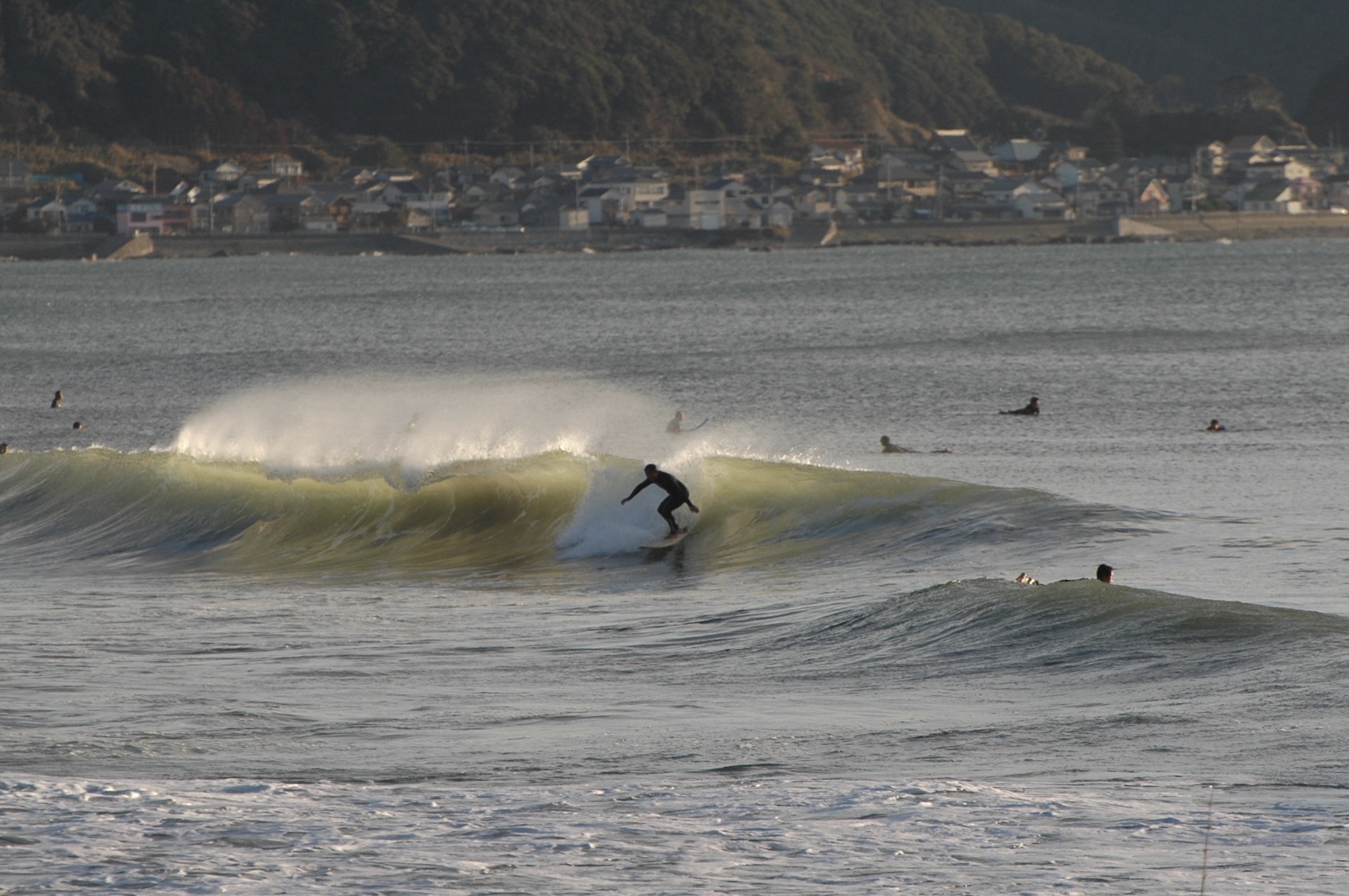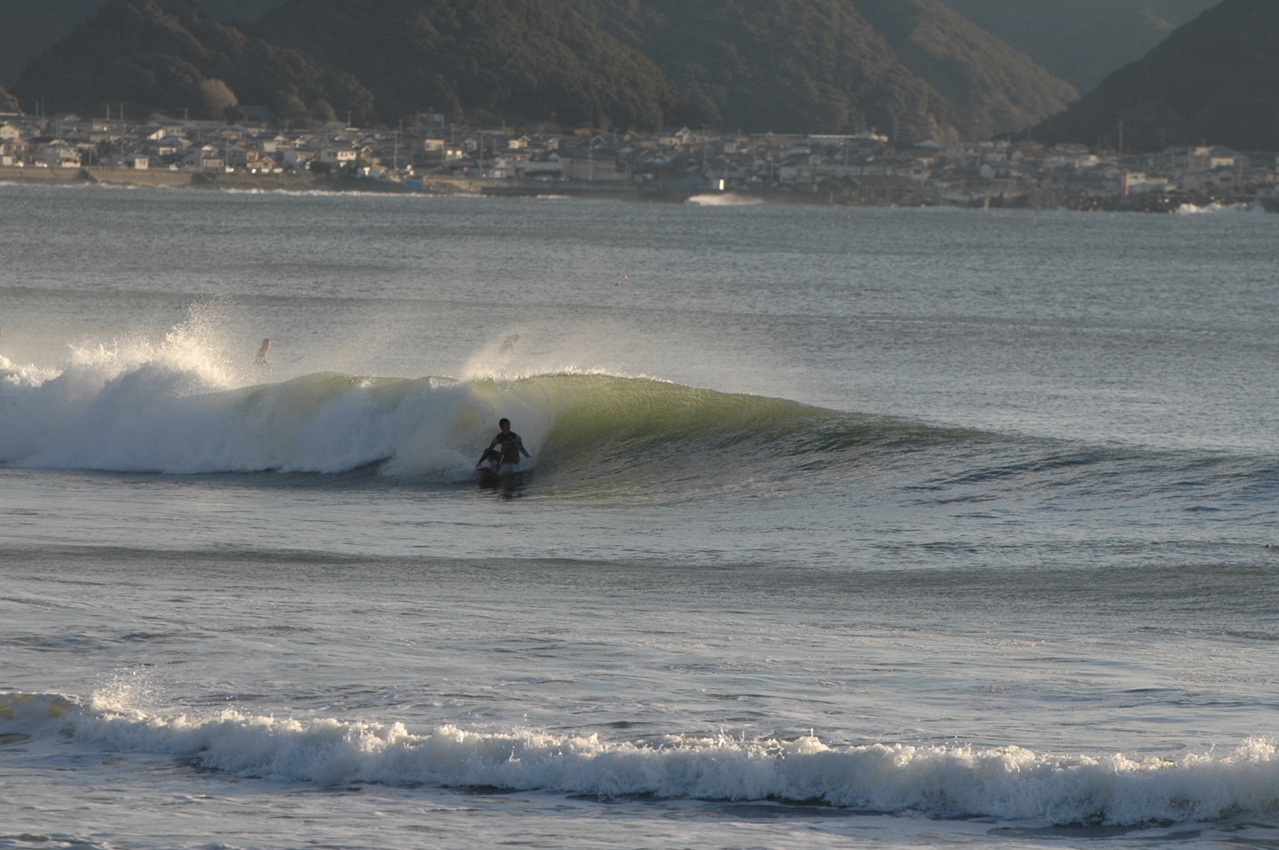河口Pはハラ〜ムネサイズ、満潮近くということもありピークは厚く早めのブレイクでしたが切れ目から乗れるとホレたチュービーな波も。