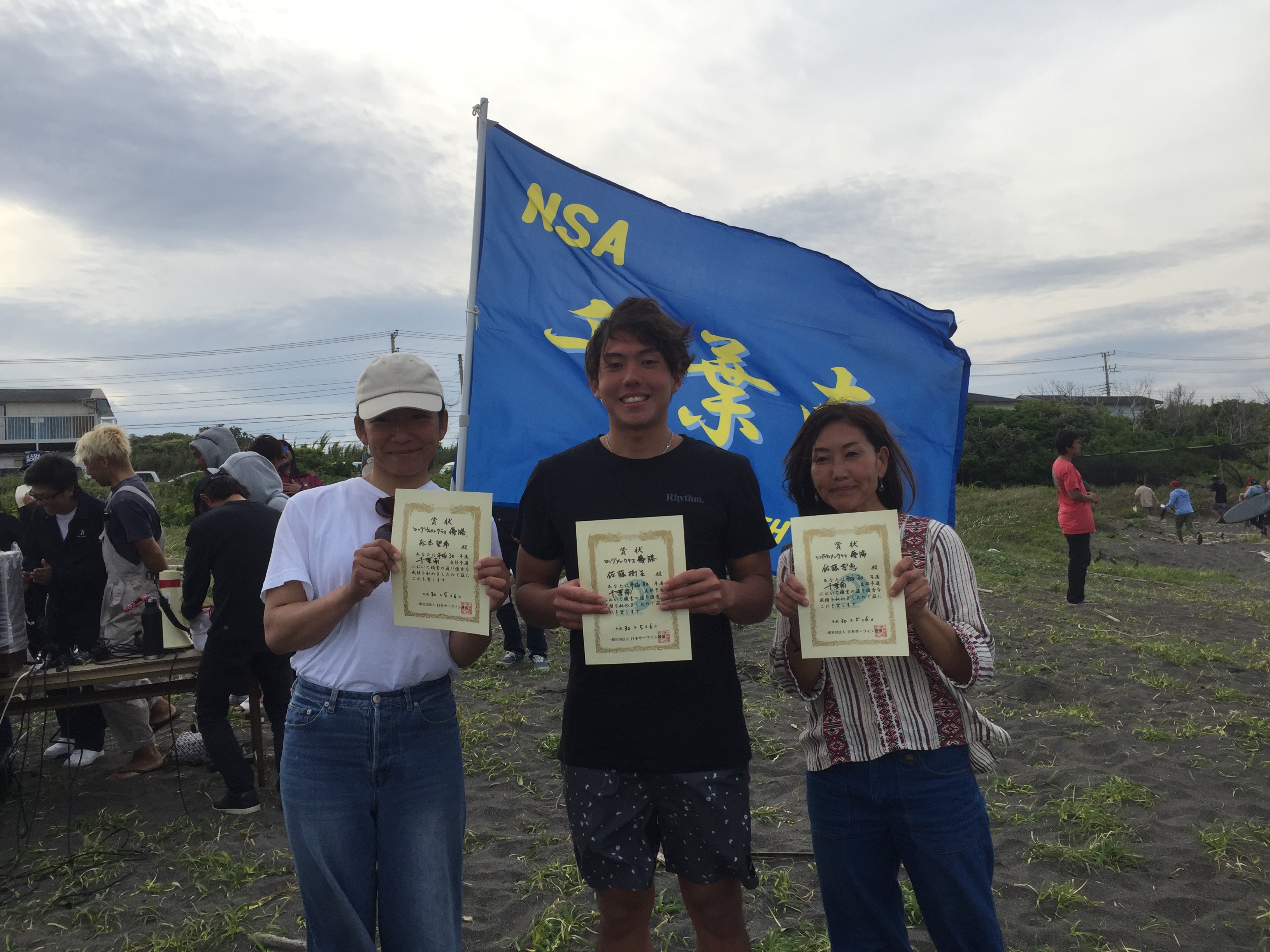 ロングボードメンクラス・佐藤樹生選手、ショートシニアウィメンクラス・佐藤雪恵選手、ロングボードウィメンクラス・松本望希選手です。