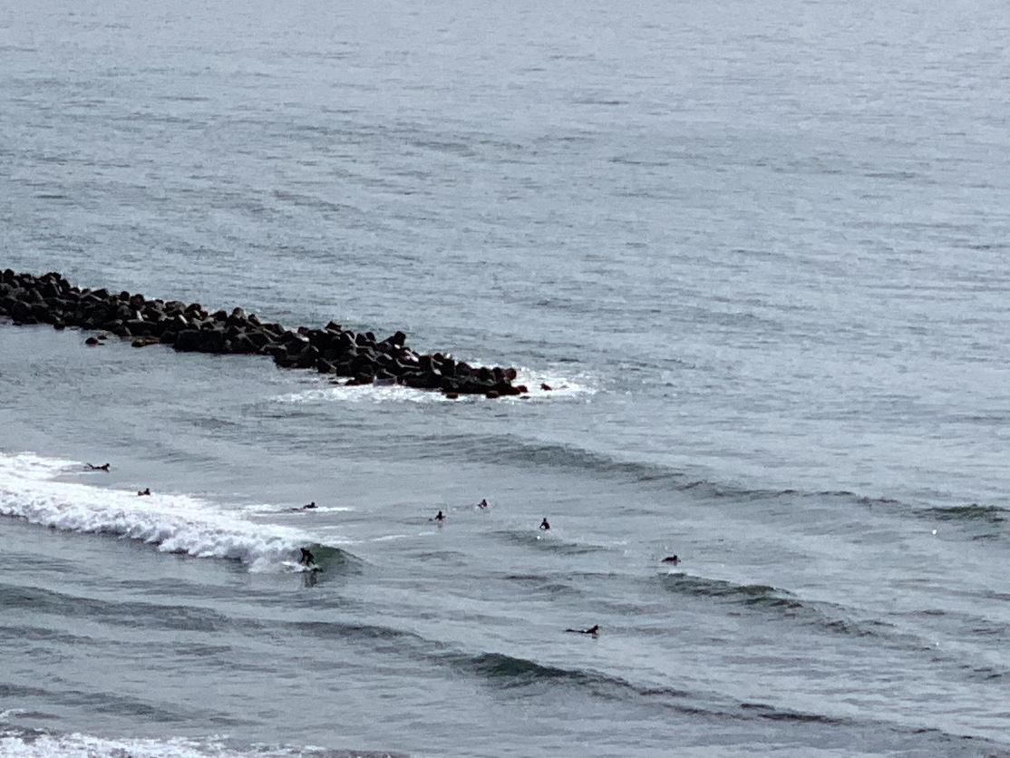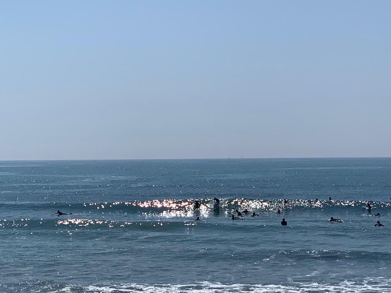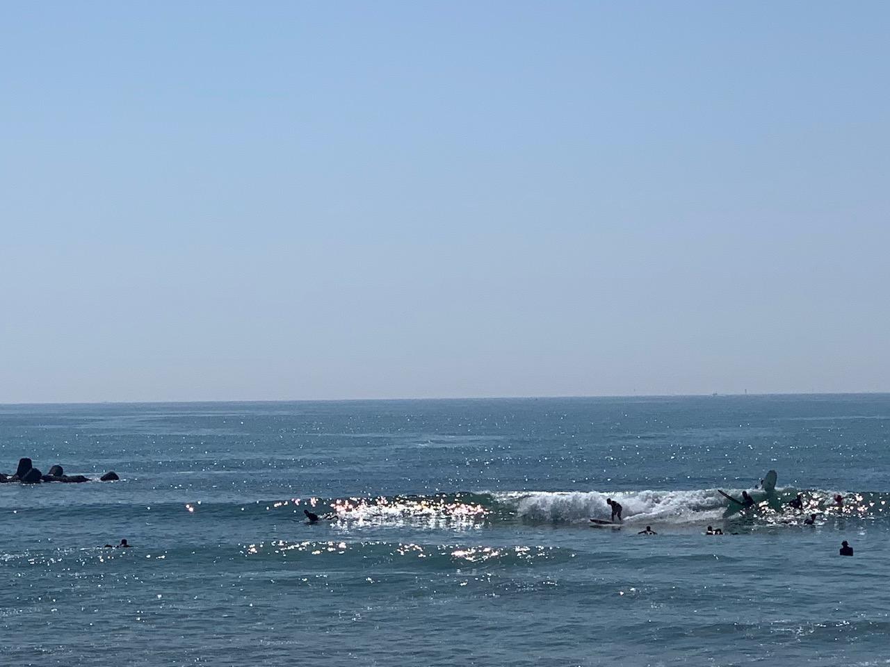 真夏日に届きそうな天気の中海は多くのサーファーで賑わっています。