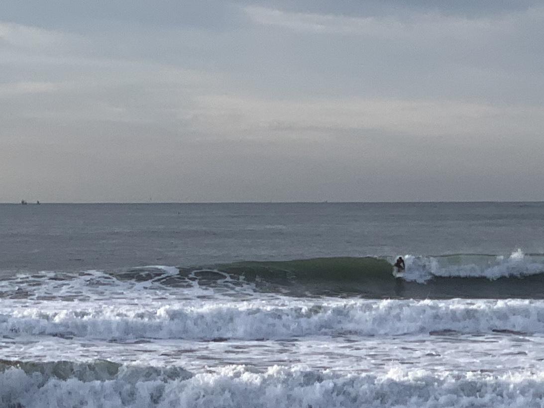 朝イチのシーサイドPはカタ〜アタマ、ウネリはやや厚く入るも、ピークはリップが厚く掘れた波に。